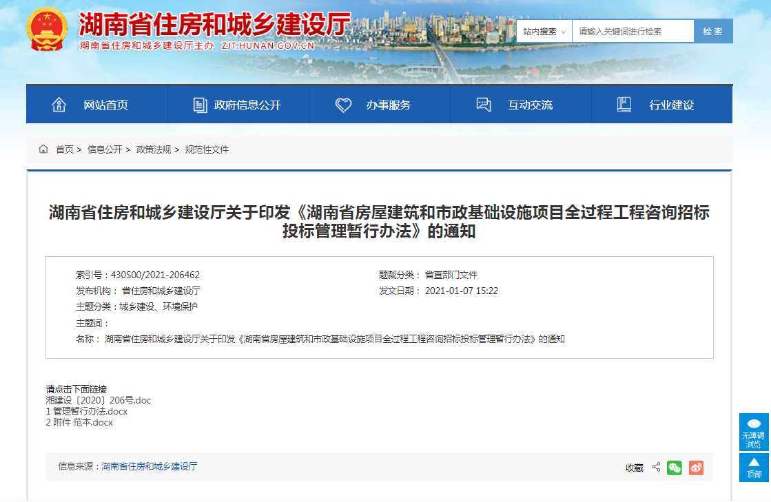 第一條 為推進房屋建筑和市政基礎設施領域全過程工程咨詢發(fā)展,規(guī)范全過程工程咨詢招標投標活動,根據(jù)《中華人民共和國招標投標法》《中華人民共和國招標投標法實施條例》《建筑工程設計招標投標管理辦法》等法律法規(guī)和《國家發(fā)展改革委 住房城鄉(xiāng)建設部關于推進全過程工程咨詢服務發(fā)展的指導意見》、《湖南省人民政府辦公廳關于完善質(zhì)量保障體系提升建筑工程品質(zhì)的若干措施的通知》等文件,結合本省實際,制定本辦法。