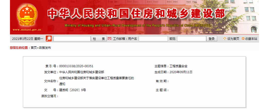 2020年9月23日,住建部官網(wǎng)發(fā)布《關(guān)于落實建設(shè)單位工程質(zhì)量首要責(zé)任的通知》,嚴(yán)格落實建設(shè)單位工程質(zhì)量首要責(zé)任。同時提出: