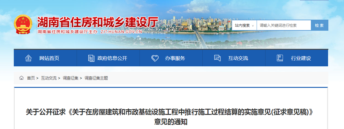 2020年5月28日,湖南省住建廳發(fā)布《關(guān)于在房屋建筑和市政基礎(chǔ)設(shè)施工程中推行施工過程結(jié)算的實施意見(征求意見稿)》,在省內(nèi)房建、市政項目中全面推行施工過程結(jié)算。