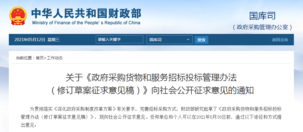 為貫徹落實(shí)《深化政府采購(gòu)制度改革方案》有關(guān)要求,完善招標(biāo)采購(gòu)方式,財(cái)政部研究起草了《政府采購(gòu)貨物和服務(wù)招標(biāo)投標(biāo)管理辦法(修訂草案征求意見稿)》,現(xiàn)向社會(huì)公開征求意見。任何單位和個(gè)人可以在2021年5月30日前,通過(guò)以下途徑和方式提出意見: