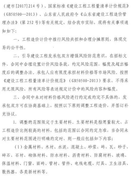 2018年1月30日,濟(jì)南市住建委印發(fā)《關(guān)于加強(qiáng)工程建設(shè)材料價格風(fēng)險控制有關(guān)事項的通知》(濟(jì)建標(biāo)字〔2018〕2號),明確工程計價中應(yīng)推行風(fēng)險共擔(dān)和合理分?jǐn)傇瓌t,承包人應(yīng)有限度承擔(dān)材料價格等市場風(fēng)險。