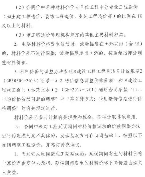 2、合同中已經(jīng)采用無限風(fēng)險、所有風(fēng)險等表述對材料價格風(fēng)險進(jìn)行明確約定的,發(fā)承包雙方可在協(xié)商基礎(chǔ)上調(diào)整工程造價,并簽訂補(bǔ)充協(xié)議。調(diào)整的范圍限定于主要材料。主要材料價格發(fā)生波動時,波動幅度在±5%以內(nèi)(含5%)的,材料價差不進(jìn)行調(diào)整;波動幅度超出±5%的,按照超出部分調(diào)整材料價差。