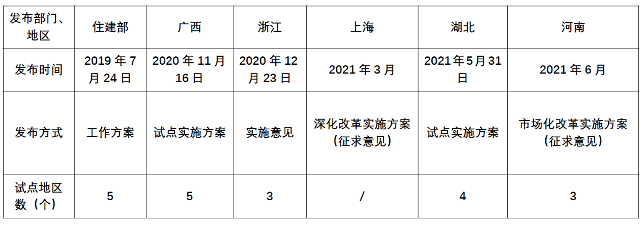 2020年7月24日,住房和城鄉(xiāng)建部辦公廳印發(fā)關(guān)于工程造價改革工作方案的通知(建辦標(biāo)〔2020〕38號,以下簡稱38號文),通知決定在北京市、浙江省、湖北省、廣東省、廣西壯族自治區(qū)等五個地區(qū)開展方案試點工作。截至本稿起筆日(2021.6.3),廣西、浙江和湖北等三個試點地區(qū)相繼發(fā)布有關(guān)方案通知,北京、廣東尚未見官方相關(guān)信息。五個試點城市外,上海、河南等地的方案在征求意見中。