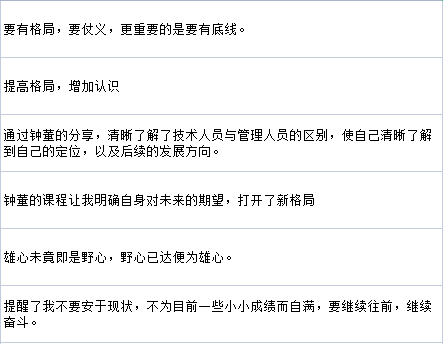 聽完鐘董的分享,鼎正工程咨詢股份有限公司董事長王雁然對此次中量鼎正EMBA的聯(lián)合開辦表示祝賀。他表示,鐘董的分享充滿激勵與鼓勵,希望學(xué)員們能夠從中學(xué)習(xí)積極追求的樂觀心態(tài),在這寶貴的一天里,主動思考、互動,在有限的時間內(nèi),創(chuàng)造無限的學(xué)習(xí)價值。