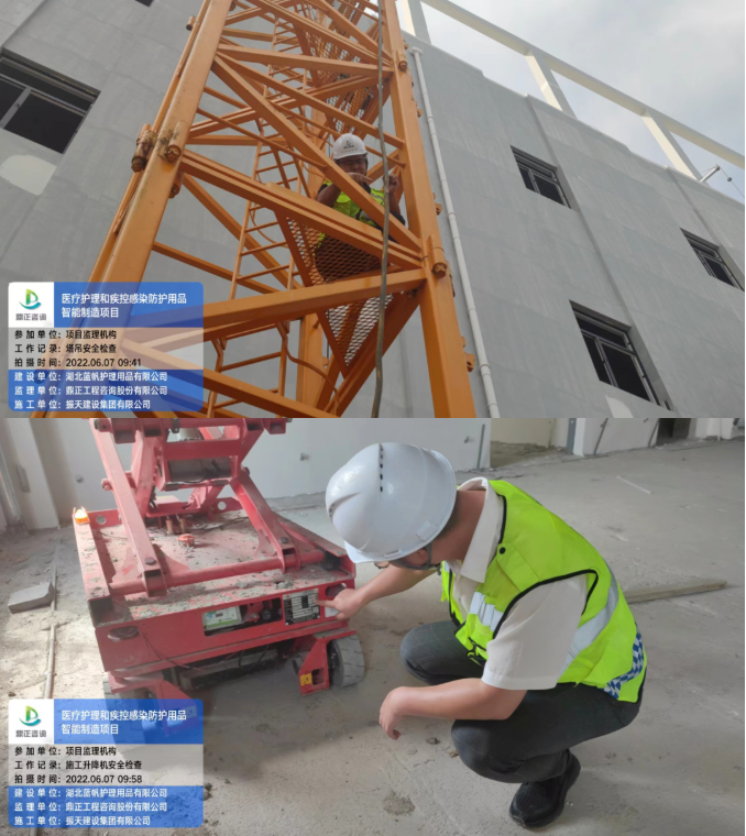 6月7日,醫(yī)療護理和疾控感染防護用品智能制造項目總監(jiān)理工程師陳雄對施工現場進行塔吊、物料提升機、施工升降機、吊籃、臨時用電進行聯合檢查,現場抽檢施工單位的安全生產規(guī)范。此次檢查以安全生產細化管理為要求,以查隱患、找短板、促整改、防事故為目的。安全是確保工程質量的前提條件,質量是建設單位所追求的最終目標,安全則是實現這一目標的基本環(huán)境條件,安全監(jiān)理是這一環(huán)境條件的保護神。
