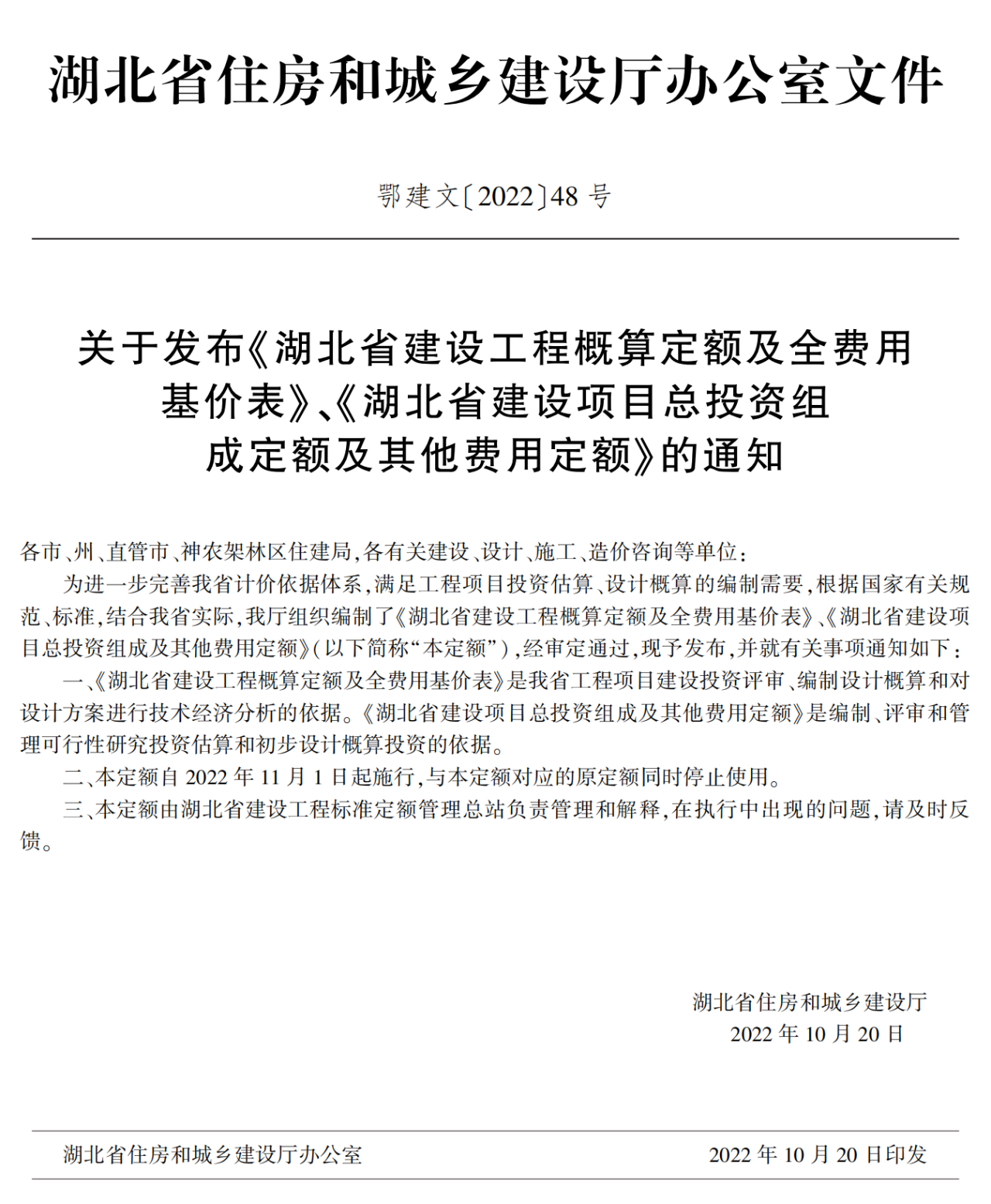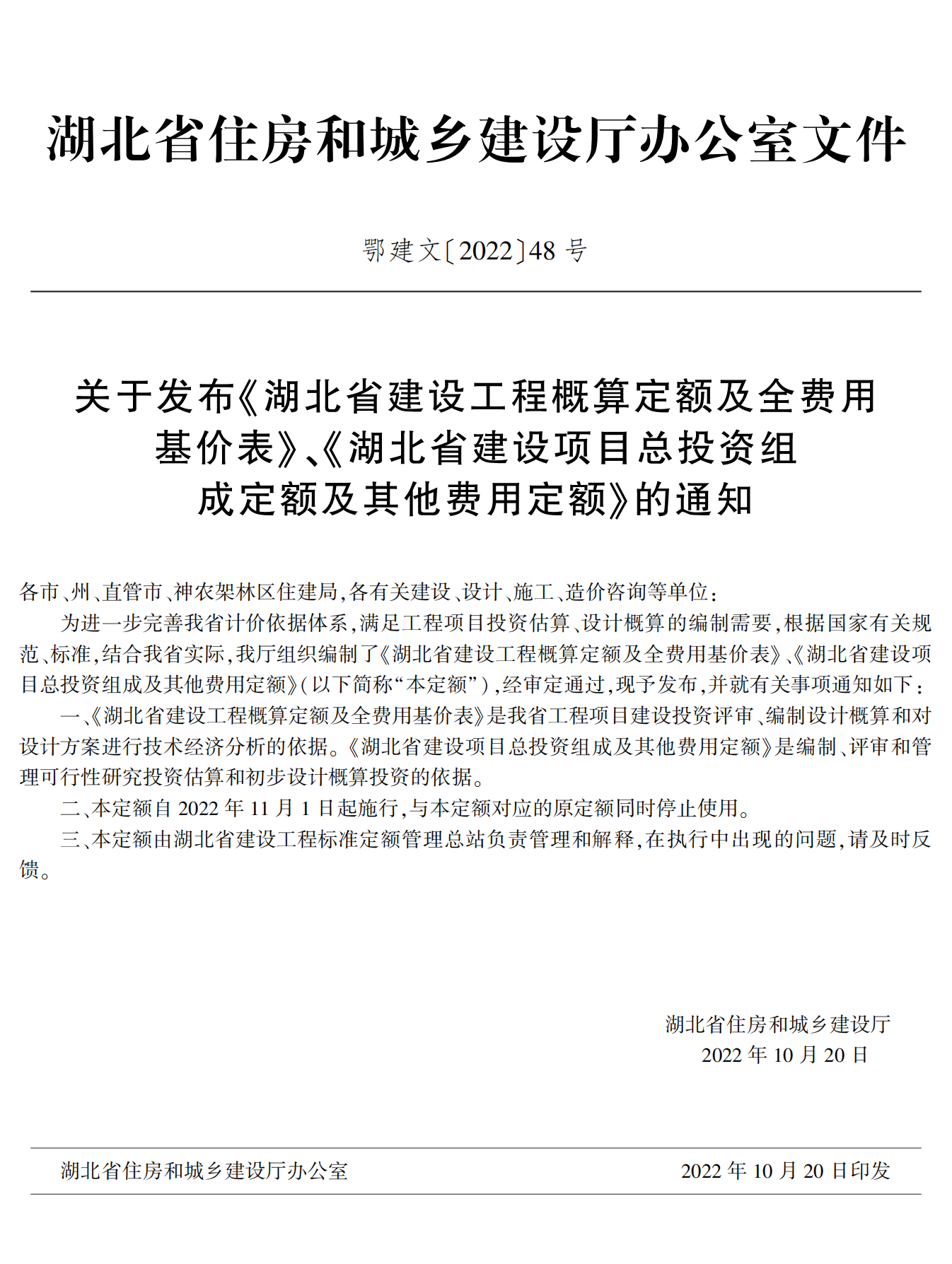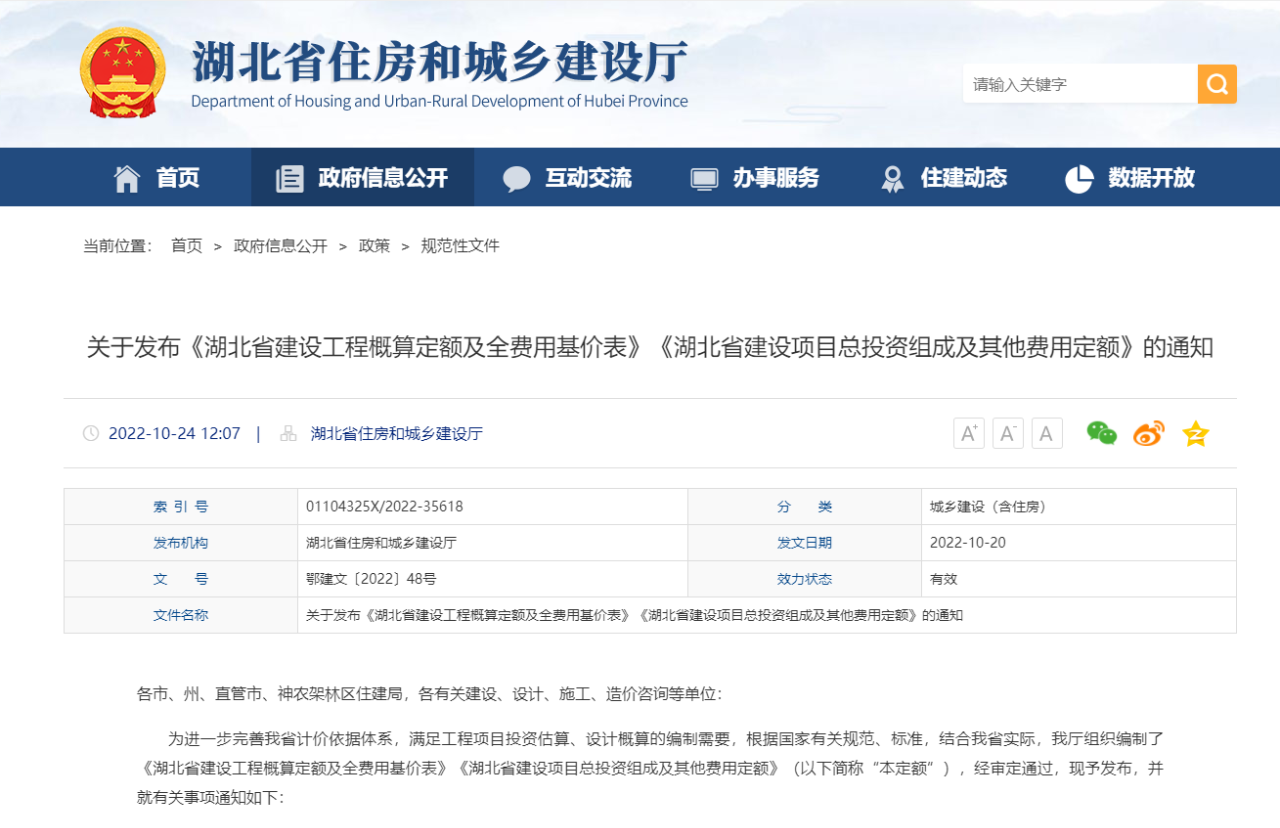 湖北省住建廳發(fā)布《湖北省建設(shè)工程概算定額及全費用基價表》《湖北省建設(shè)項目總投資組成及其他費用定額》的通知