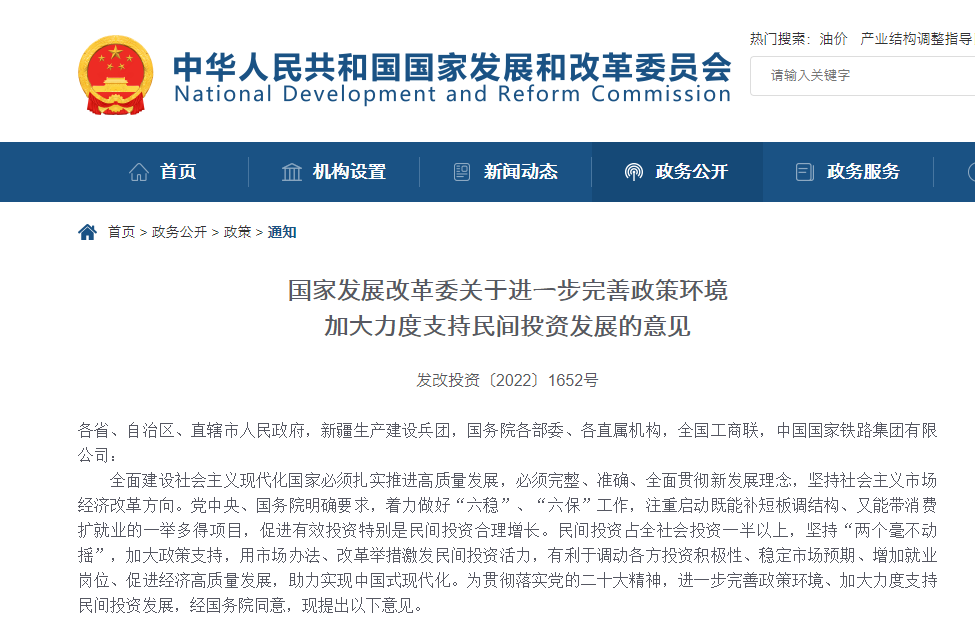 全面建設(shè)社會(huì)主義現(xiàn)代化國(guó)家必須扎實(shí)推進(jìn)高質(zhì)量發(fā)展,必須完整、準(zhǔn)確、全面貫徹新發(fā)展理念,堅(jiān)持社會(huì)主義市場(chǎng)經(jīng)濟(jì)改革方向。黨中央、國(guó)務(wù)院明確要求,著力做好“六穩(wěn)”、“六?!惫ぷ鳎⒅貑?dòng)既能補(bǔ)短板調(diào)結(jié)構(gòu)、又能帶消費(fèi)擴(kuò)就業(yè)的一舉多得項(xiàng)目,促進(jìn)有效投資特別是民間投資合理增長(zhǎng)。民間投資占全社會(huì)投資一半以上,堅(jiān)持“兩個(gè)毫不動(dòng)搖”,加大政策支持,用市場(chǎng)辦法、改革舉措激發(fā)民間投資活力,有利于調(diào)動(dòng)各方投資積極性、穩(wěn)定市場(chǎng)預(yù)期、增加就業(yè)崗位、促進(jìn)經(jīng)濟(jì)高質(zhì)量發(fā)展,助力實(shí)現(xiàn)中國(guó)式現(xiàn)代化。為貫徹落實(shí)黨的二十大精神,進(jìn)一步完善政策環(huán)境、加大力度支持民間投資發(fā)展,經(jīng)國(guó)務(wù)院同意,現(xiàn)提出以下意見(jiàn)。