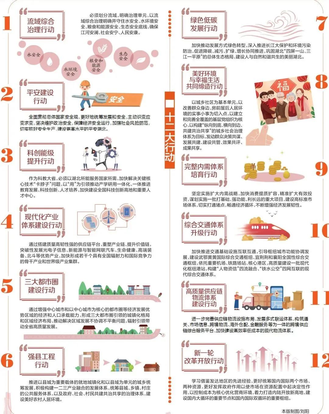 4月18日,湖北省政府新聞辦召開《關(guān)于加快建設(shè)全國構(gòu)建新發(fā)展格局先行區(qū)的實(shí)施意見》(以下簡稱《實(shí)施意見》)精神解讀系列新聞發(fā)布會(huì)第一場?!秾?shí)施意見》共分三大部分和附件。第一部分是總體要求,主要闡述文件起草的指導(dǎo)思想、總體思路、基本原則、主要目標(biāo);第二部分是主體,圍繞統(tǒng)籌發(fā)展和安全、統(tǒng)籌城鄉(xiāng)區(qū)域和資源環(huán)境、統(tǒng)籌國內(nèi)國際兩個(gè)市場兩種資源,部署“十二大行動(dòng)”(具體內(nèi)容見下圖);第三部分從組織領(lǐng)導(dǎo)、完善配套政策、加強(qiáng)考核評估等方面強(qiáng)調(diào)了推進(jìn)實(shí)施的保障措施。附件為加快建設(shè)全國構(gòu)建新發(fā)展格局先行區(qū)的主要指標(biāo),設(shè)定了71項(xiàng)數(shù)據(jù)指標(biāo)。