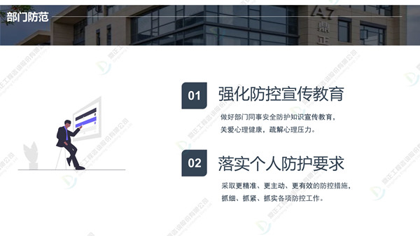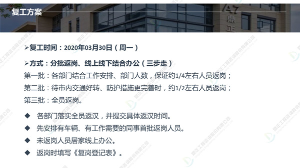 分批返崗、線上線下結(jié)合辦公,鼎正人的復(fù)工準(zhǔn)備工作正有序進(jìn)行。在疫情防控、復(fù)工復(fù)產(chǎn)兩手抓的同時,鼎正咨詢將一如既往地為客戶提供專業(yè)的全過程工程咨詢服務(wù)。