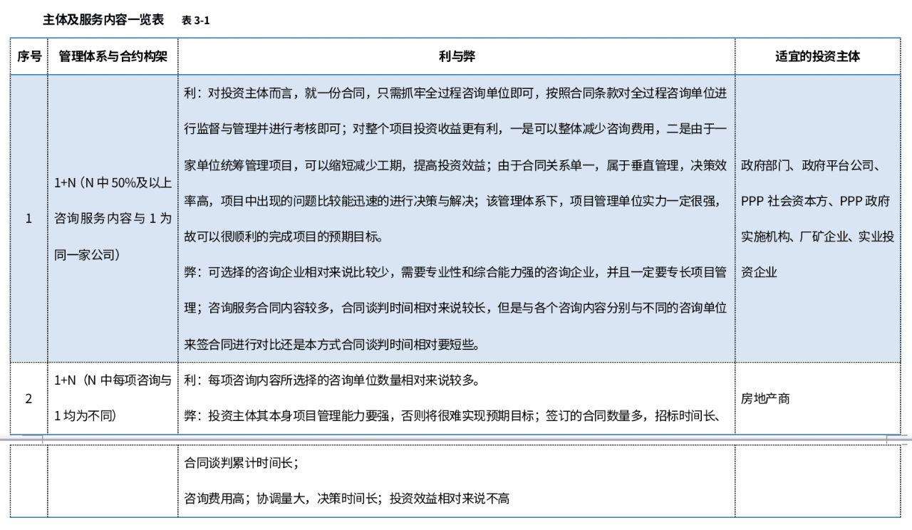不同的投資主體所需的服務內(nèi)容和管理模式不一樣,就會導致項目管理體系上和合約構架上不一樣,以下通過表格闡述不同的管理體系和合約構架的利與弊及適宜的投資主體(本文倡導的全過程咨詢以項目管理為主線,用1表示,前期咨詢、監(jiān)理、造價、招標代理、勘察設計管理等用N表示):
