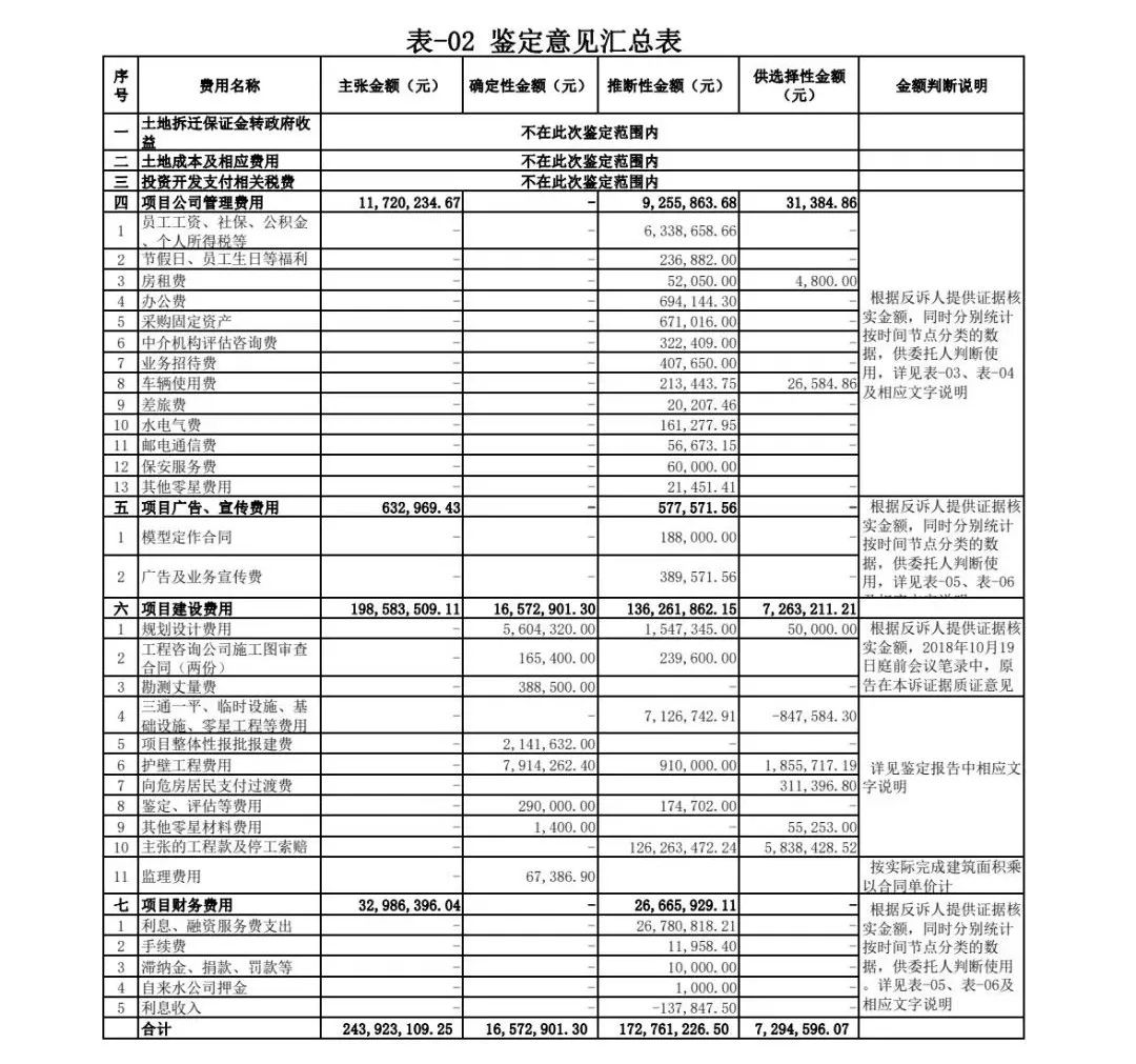 由于本項目涉及費用項目、金額均較大,《鑒定意見書》中分別根據(jù)證據(jù)情況、國家文件規(guī)定、解除合同時間等分類方式,逐項對金額進行了分類,并附加相關說明,為法庭判決提供了數(shù)據(jù)支撐。最終鑒定確定性金額16,572,901.30元,推斷性金額172,761,226.50 元,供選擇性金額7,294,596.07 元,具體詳表-02