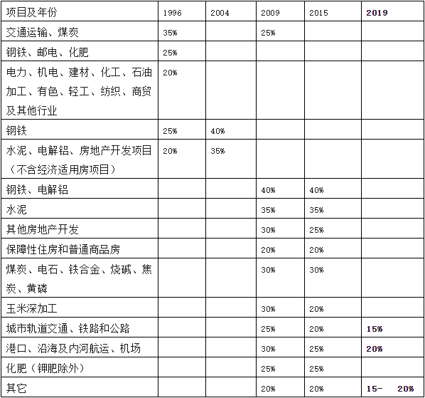 國發(fā)〔1996)35號規(guī)定了項目資本金占總投資最低比例,后續(xù)年份多次發(fā)文調(diào)整,具體整理如下: