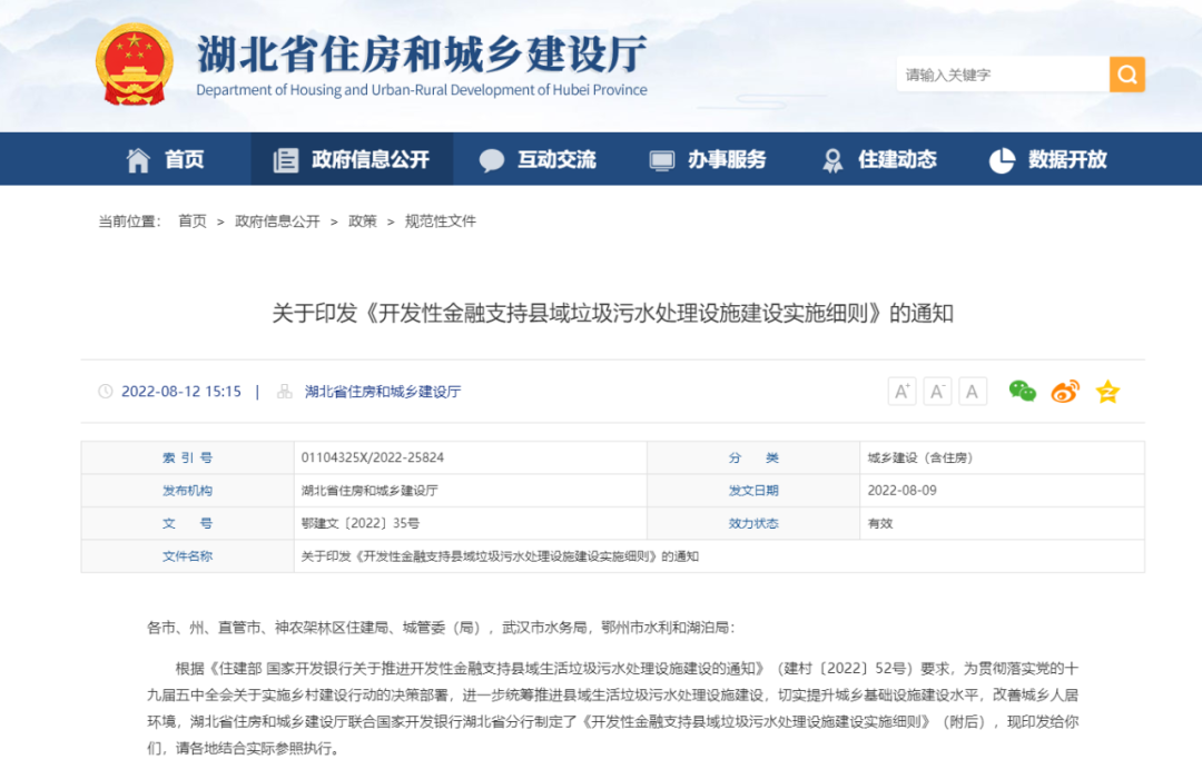 近日,湖北省住建廳發(fā)布關(guān)于印發(fā)《開發(fā)性金融支持縣域垃圾污水處理設施建設實施細則》的通知,力爭完成“十四五”期間湖北省縣域垃圾污水處理設施高標準全覆蓋的工作目標。