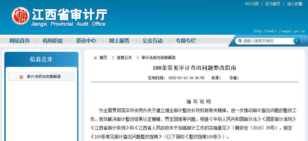 為進一步推動審計查出問題整改工作,加強對審計整改結果認定的指導,江西省審計廳印發(fā)了《100條常見審計查出問題整改指南》(以下簡稱《整改指南100條》)。《整改指南100條》按照常見的重大政策措施落實、預算管理、政府采購及招投標、基本建設、內控管理、企業(yè)管理、自然資源、社保資金及安居工程、金融管理、國外貸援款共10類審計內容進行問題分類,列舉了100個常見問題并給出相對應的整改方法說明,供審計機關和整改責任單位在審計整改工作中參照落實。整改特色亮點一是突出落實被審計單位整改主體責任;二是突出健全完善長效機制;三是突出問題分類整改。