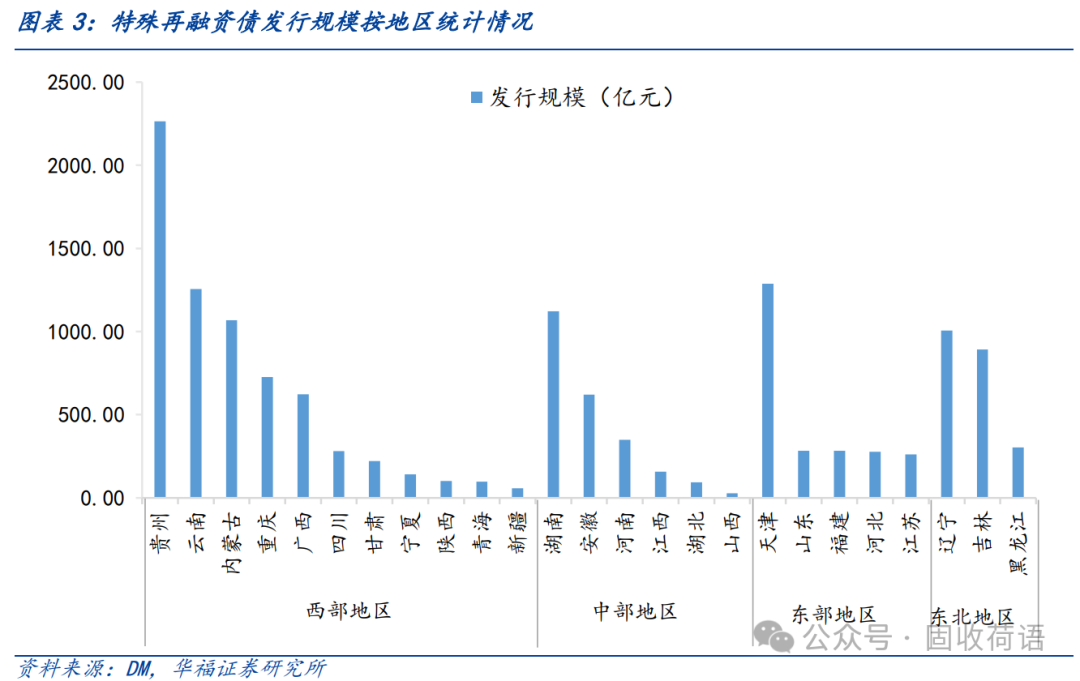 發(fā)行集中在西部地區(qū)。相較于東、中部地區(qū),西部地區(qū)整體綜合財(cái)力較弱,債務(wù)負(fù)擔(dān)較重,因此在上級(jí)支持方面存在較大優(yōu)勢(shì)。