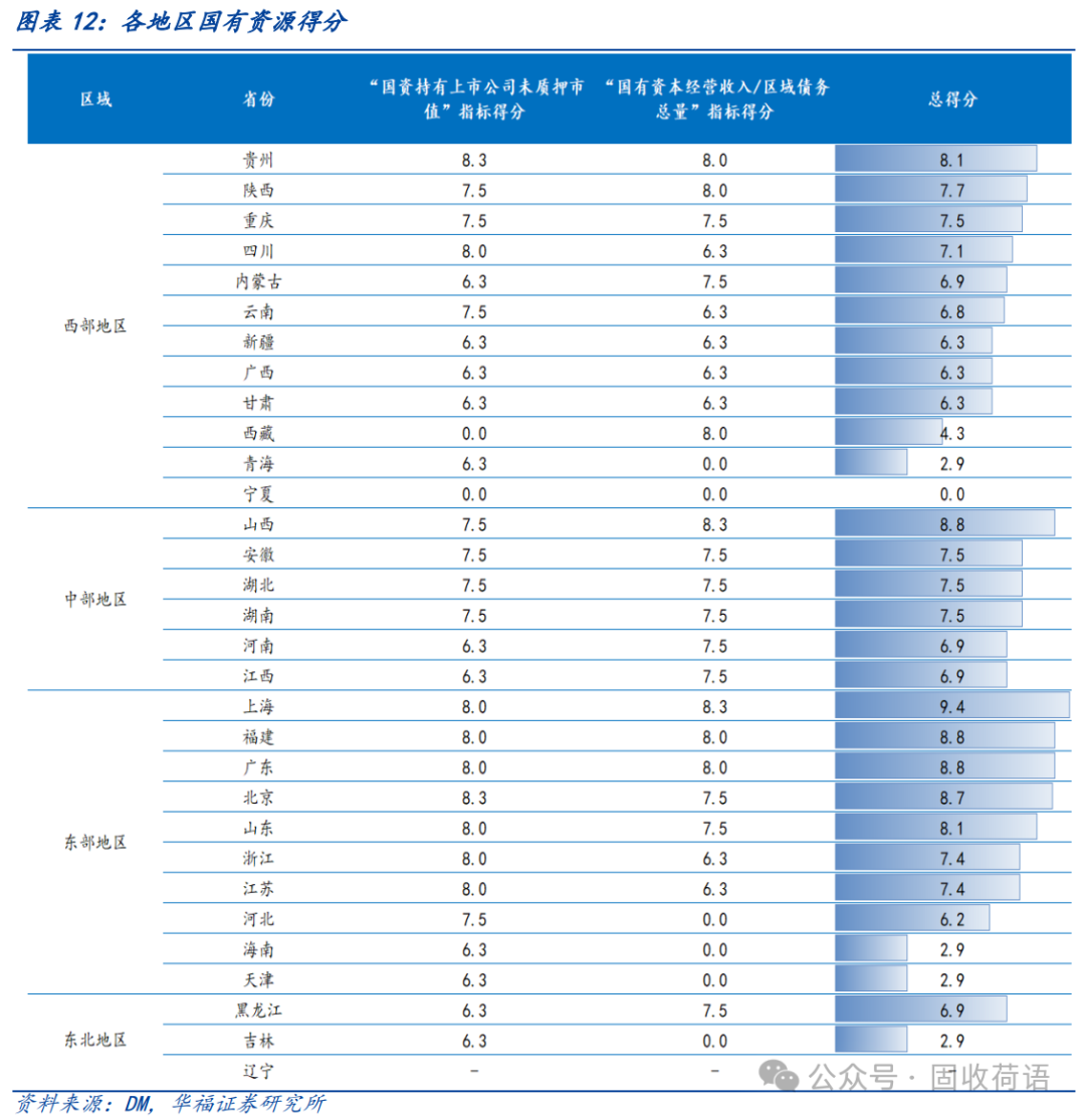 (2)中部地區(qū)的化債資源整體較一般,可結(jié)合自身優(yōu)勢(shì)充分利用各類資源緩解債務(wù)風(fēng)險(xiǎn)。例如,安徽可以利用其豐富的上市國(guó)企資源進(jìn)行化債。