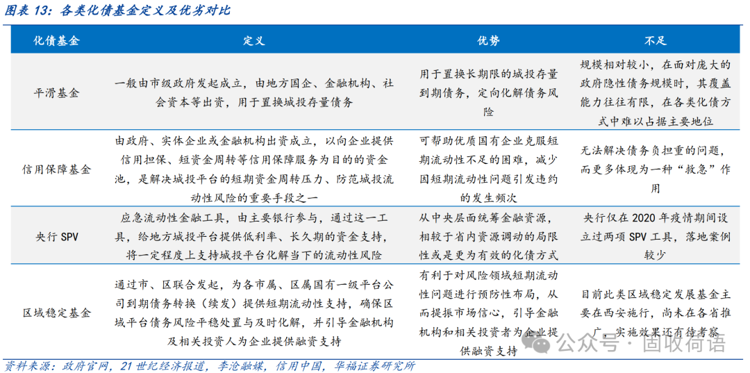 設(shè)立“化債基金”作為地方政府有效的管控城投債務(wù)風(fēng)險(xiǎn)的手段,被各地廣泛運(yùn)用,包括平滑基金、信用保障基金、央行SPV等?;鹳Y金主要來(lái)源于省內(nèi)/市內(nèi),調(diào)動(dòng)的是區(qū)域內(nèi)的金融資源,但規(guī)模相對(duì)有限;SPV在投放貸款的同時(shí)或要求抵押品,因此國(guó)有資源更為豐富的區(qū)域預(yù)計(jì)將獲得更大的支持。