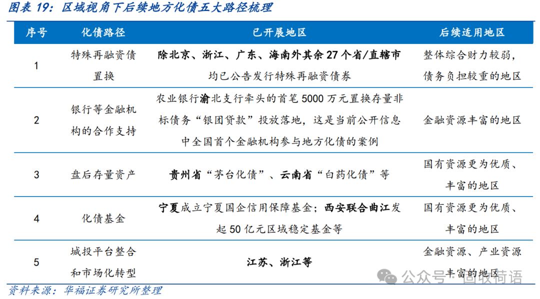 財(cái)政部《地方全口徑債務(wù)清查統(tǒng)計(jì)填報(bào)說(shuō)明》中提出六種常見的債務(wù)化解舉措,具體為(1)安排財(cái)政資金償還;(2)出讓政府股權(quán)以及經(jīng)營(yíng)性國(guó)有資產(chǎn)權(quán)益償還;(3)利用項(xiàng)目結(jié)轉(zhuǎn)資金、經(jīng)營(yíng)收入償還;(4)合規(guī)轉(zhuǎn)化為企業(yè)經(jīng)營(yíng)性債務(wù);(5)通過(guò)借新還舊、展期等方式償還;(6)采取破產(chǎn)重整或清算方式化解。同時(shí),根據(jù)各地化債動(dòng)態(tài)表述,各地根據(jù)自身情況,積極探索了金融機(jī)構(gòu)貸款置換、城投平臺(tái)整合或轉(zhuǎn)型、特殊再融資債置換、設(shè)立化債基金等方式推動(dòng)化債進(jìn)程。